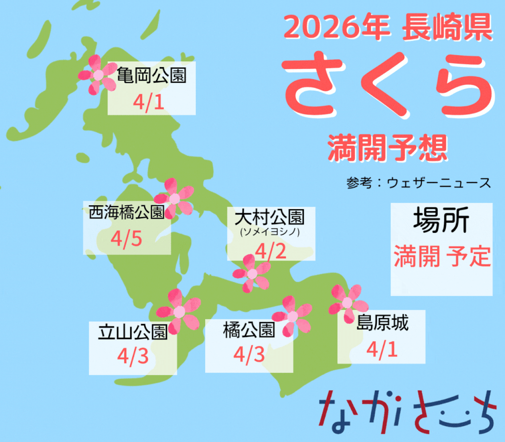 また、場所によって満開の時期に多少ずれがあります。長崎県内の主な開花予想・満開予想はお天気ナビゲータを参考にまとめています。