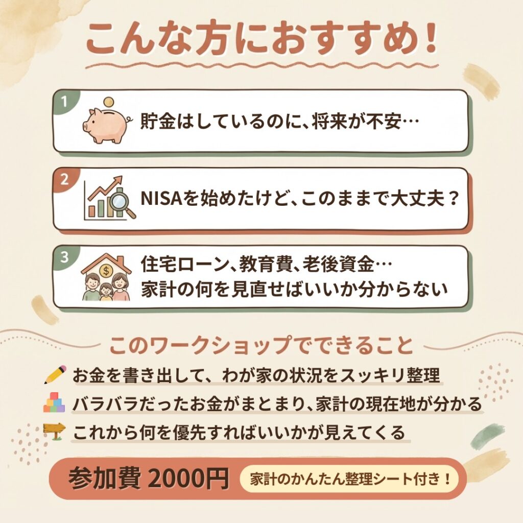 このセミナーをきっかけに、“なんとなく家計”から一歩踏み出し、未来を切り拓くお金の力を育てていきましょう!