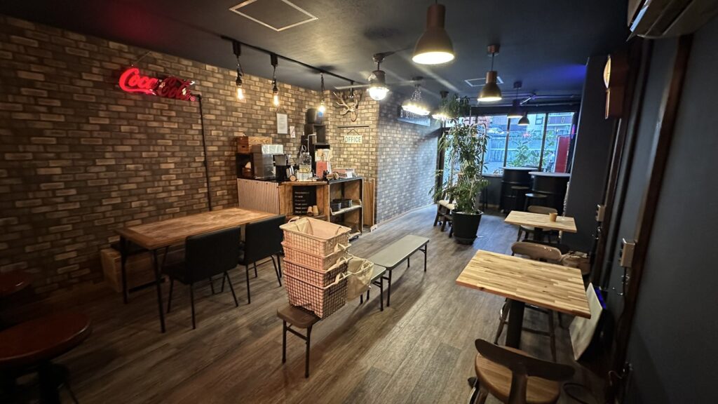 ネオンの光がやさしく反射するレンガ壁に、木のぬくもりを感じる家具が並ぶ店内。