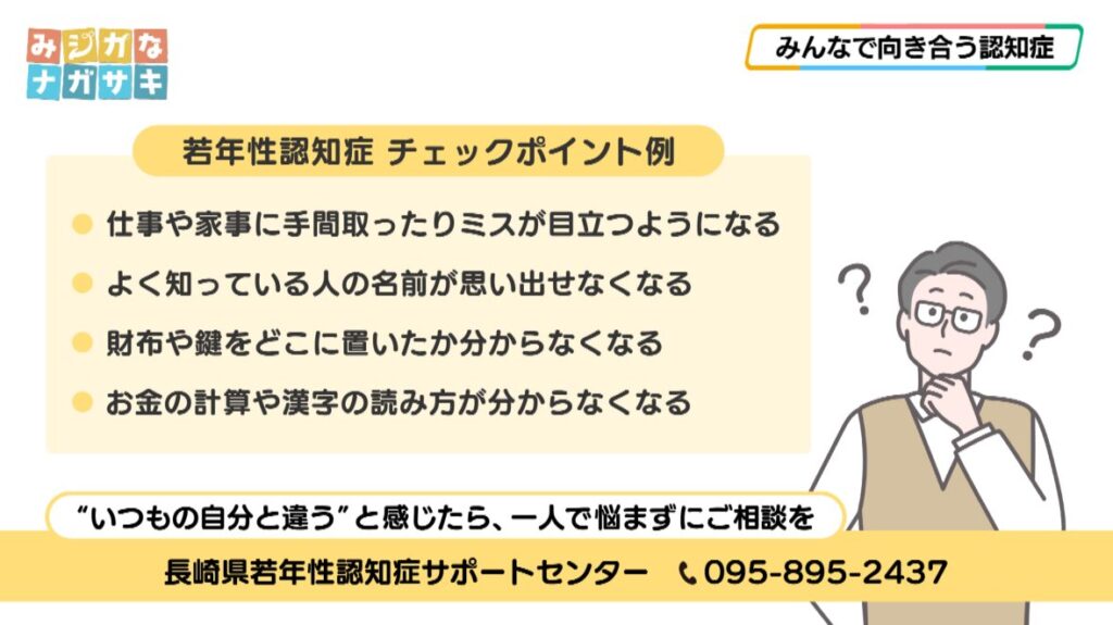 長崎県では、専門の相談員である「若年性認知症支援コーディネーター」が、医療機関の紹介やサービスの案内を行うなど、一人一人に寄り添った支援に取り組んでいます。