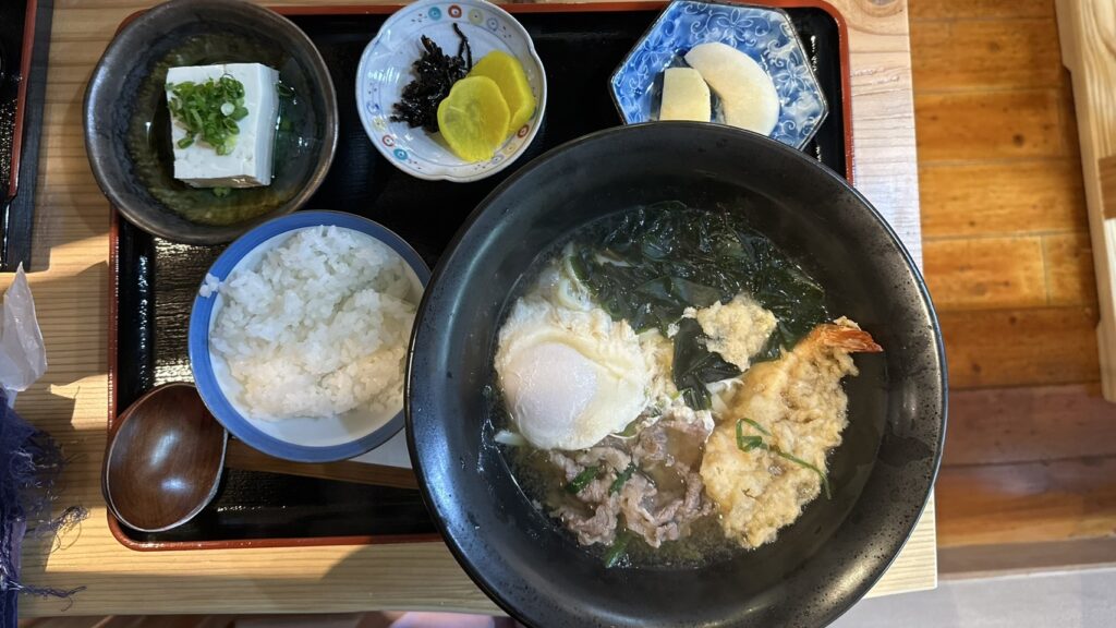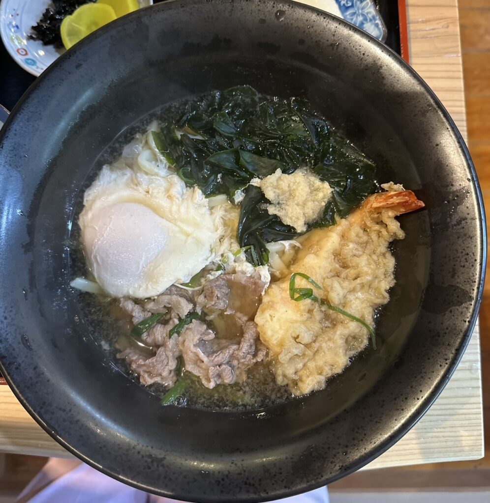 えび天、牛肉、わかめ、たまごが入った贅沢な一杯。