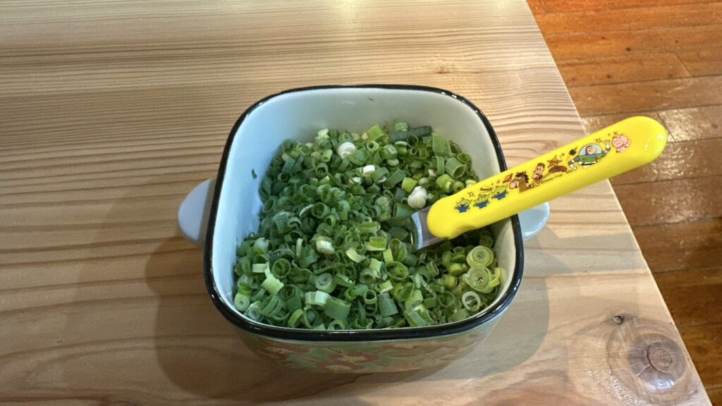 うどん到着後には自由に使える刻みねぎも提供され、好みに合わせてトッピング可能。ネギ好きにはたまりません。