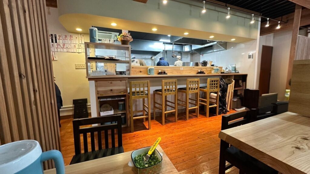木を基調とした明るい店内は、カウンター席とテーブル席の両方があり、おひとりさまから家族連れまで利用しやすい雰囲気です。