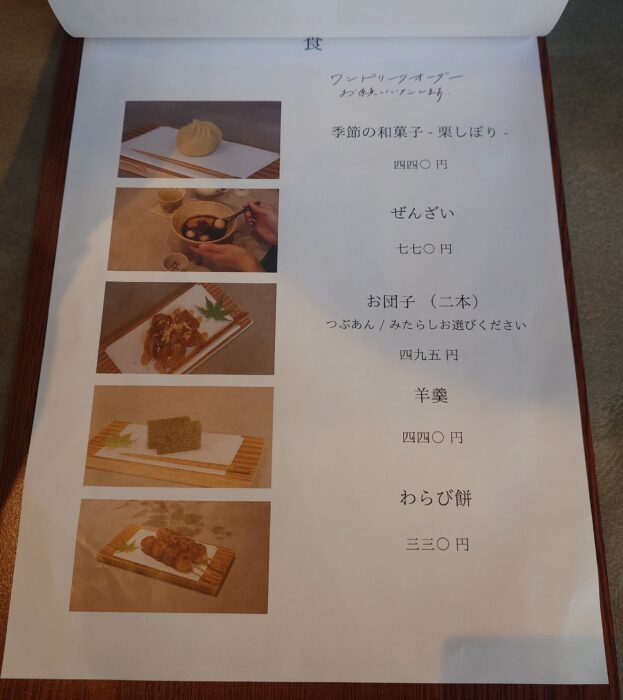 フードメニューも迷いますね。お友達とシェアしながら楽しむのも良さそう。単品注文も可能です。※季節の和菓子は12月から「冬季限定和菓子 – 紫芋のういろう -」になっています。