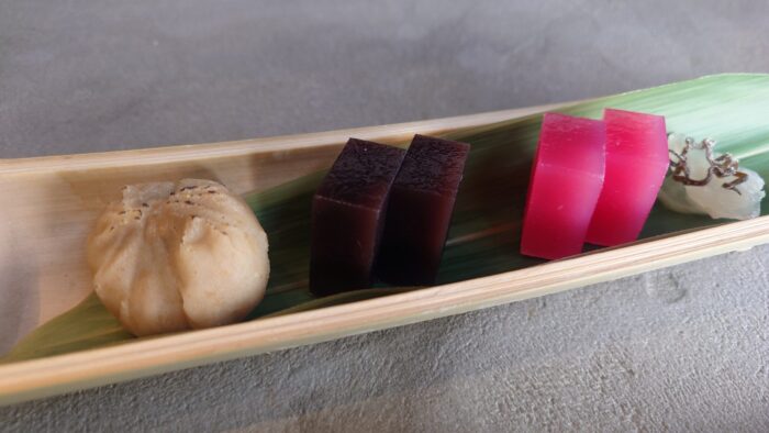 漬物には塩昆布がかかっていましたが、これが良いアクセントになっています。他の和菓子をいただく前に漬物でリセットすると、より楽しめますね。