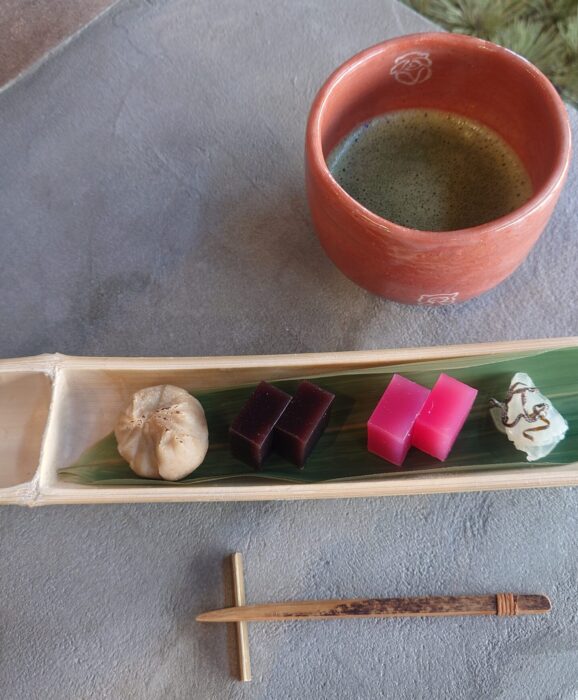 薄茶と季節の和菓子、2種類の羊羹、漬物のセットです。薄茶は「東彼杵・八女」から選ぶことができます。