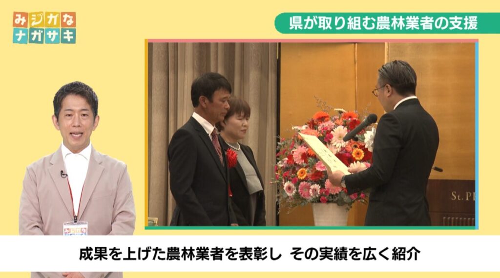 長崎県では、農地やハウスなどの生産基盤の強化やスマート農業の推進に取り組むほか、成果を上げた農林業者を表彰し、その実績を広く紹介することで、県民の農業への理解を深め、農産物の消費拡大を図っています。