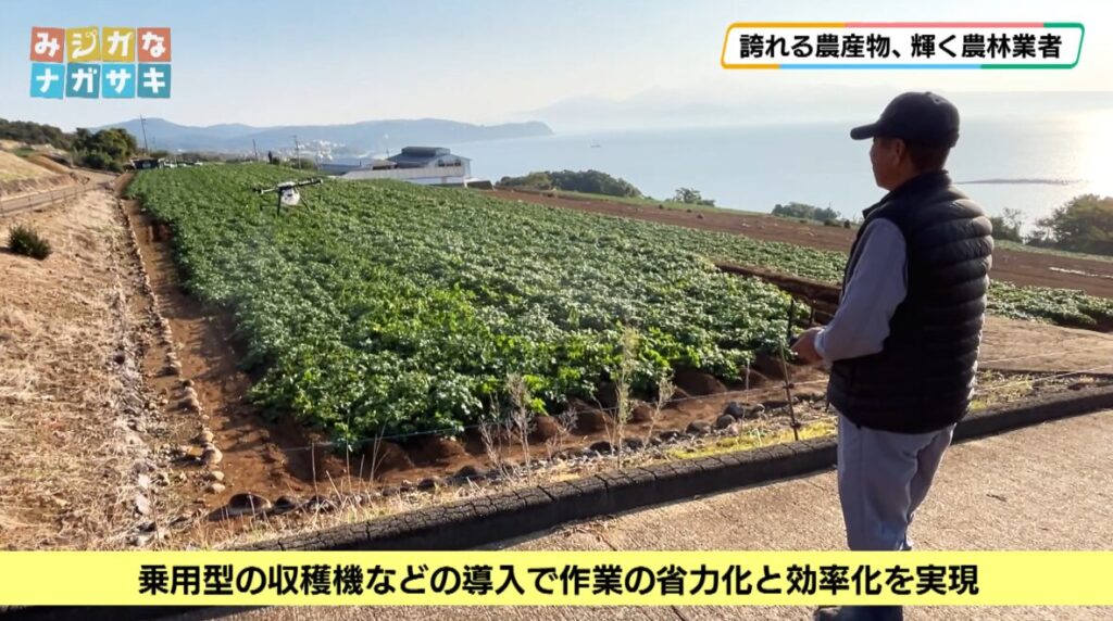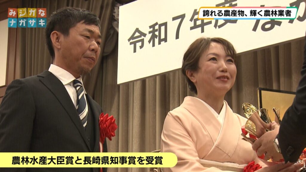 乗用型の収穫機や、ドローン防除機の導入により、作業の省力化と効率化を実現するなど、地域を代表する農林業者として活躍していることが評価され、長崎県知事賞を受賞しました。