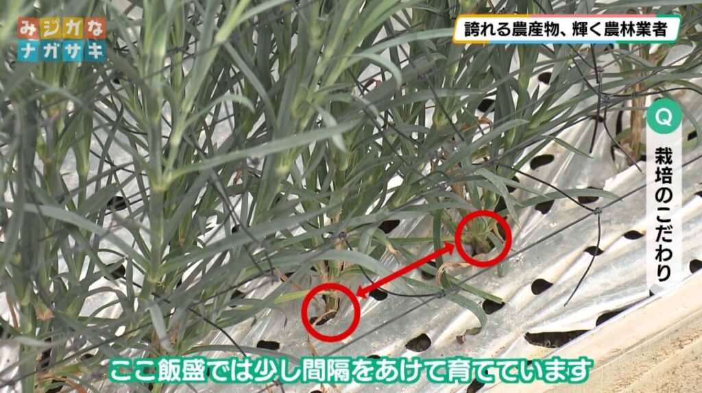 朝倉さん「他の産地だと花と花の間を狭く植えることが多いのですが、ここ飯盛では少し間隔をあけて育てています」