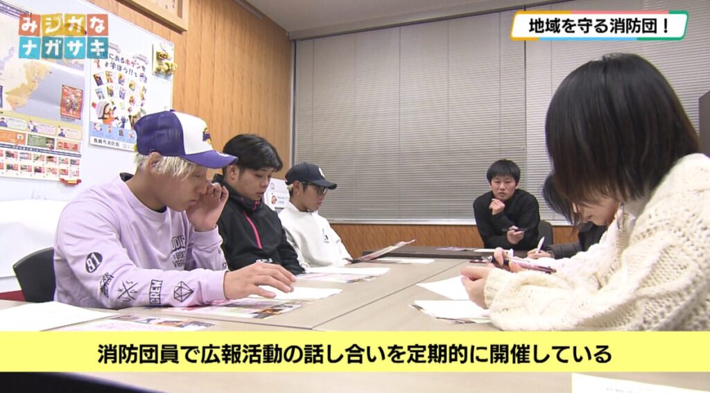 こちらでは、地域の防災意識を高めるため、消防団員たちが広報活動の内容について話し合いを進めています。