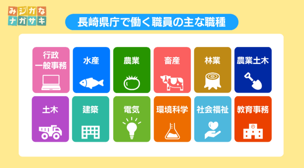 長崎県庁で働く職員には行政・一般事務職をはじめ、水産職、農業職、土木職、社会福祉職など、主に12の職種があります。
