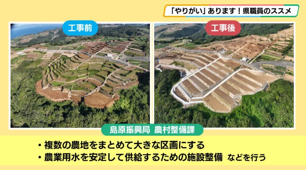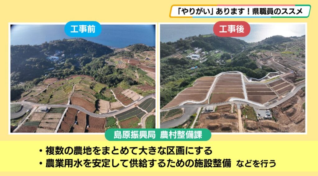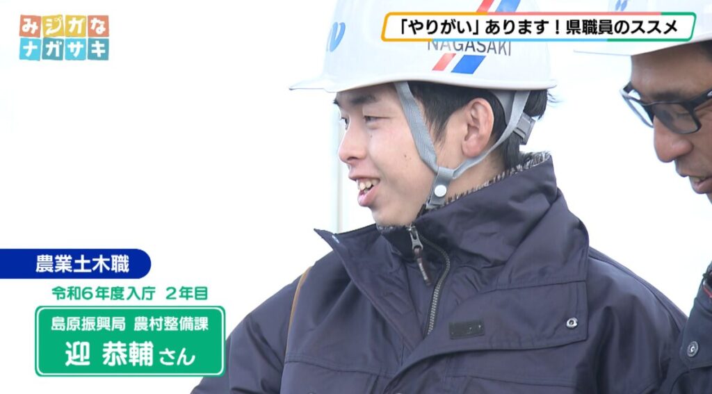 島原振興局 農村整備課 迎恭輔さん「島原振興局 農村整備課では、農地を使いやすくするために、複数の農地をまとめて大きな区画にしたり、農業用水を安定して供給するための施設整備を行うなど、地域の農業を支える基盤づくりを進めています」