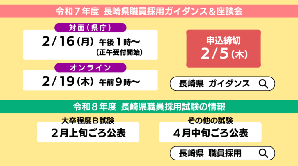 また、長崎県職員採用試験の情報は、大卒程度B試験が2月上旬ごろ、それ以外の試験については4月中旬ごろに、長崎県のウェブサイトで公開します。