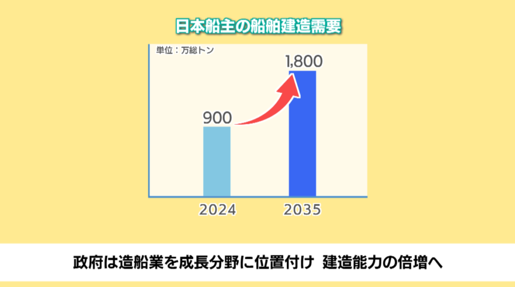 日本政府としても造船業を成長分野の一つと位置付け、建造能力の倍増を目指した取り組みを進めています。