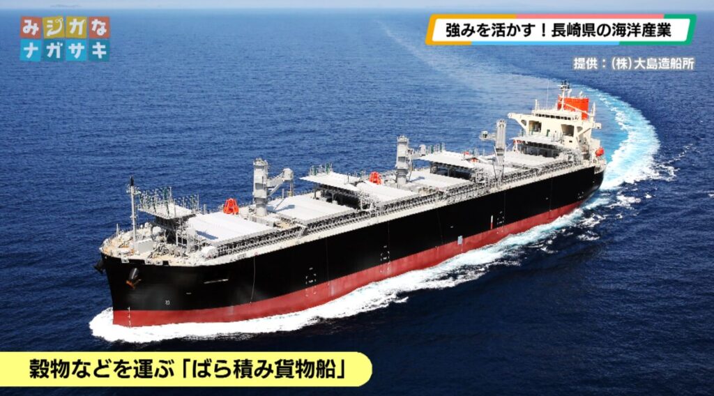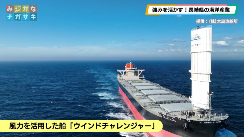 大島造船所では、穀物などを運ぶ「ばら積み貨物船」の建造を中心に、風力を活用した船「ウインドチャレンジャー」や電力で動く船など、環境に配慮した船の建造も行ってきました。