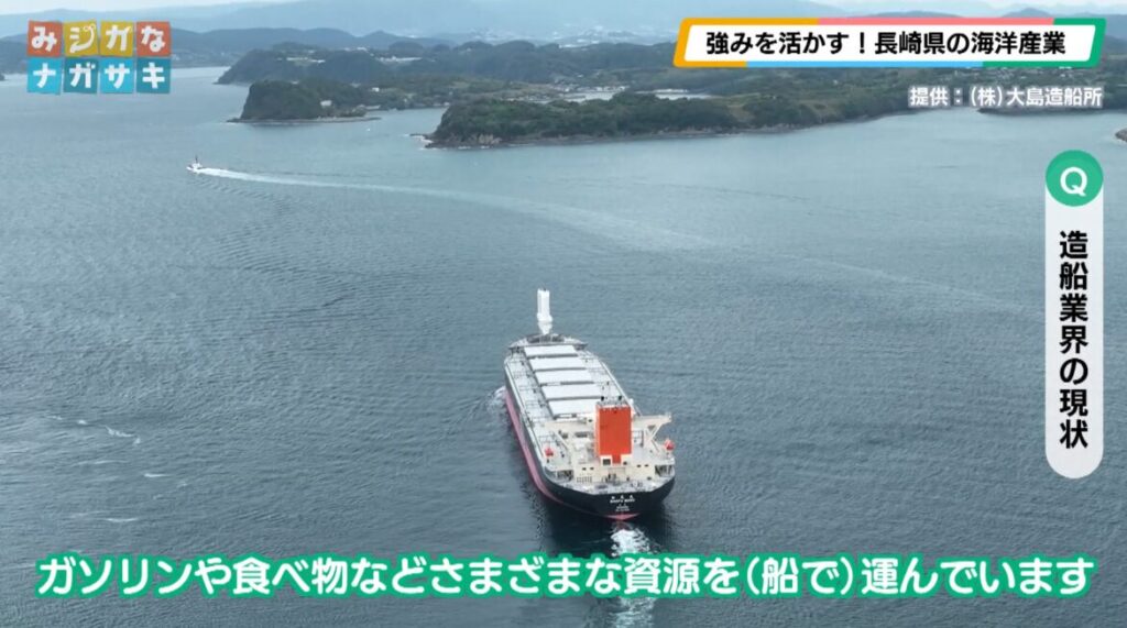 (株)大島造船所 椎葉邦男さん「まず、船の役割を説明します。ガソリンや食べ物などさまざまな資源を船で運んでいます。みんなの生活に必要な物が運ばれてきています」