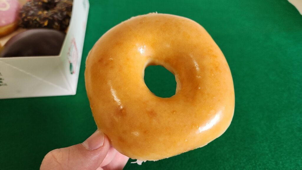 看板商品は、ブランドを代表する Original Glazed Doughnut(オリジナル・グレーズド®)。ふわふわとしたイースト生地に、甘いグレーズがコーティングされたシンプルなドーナツで、口の中でとろけるような軽い食感が魅力です。