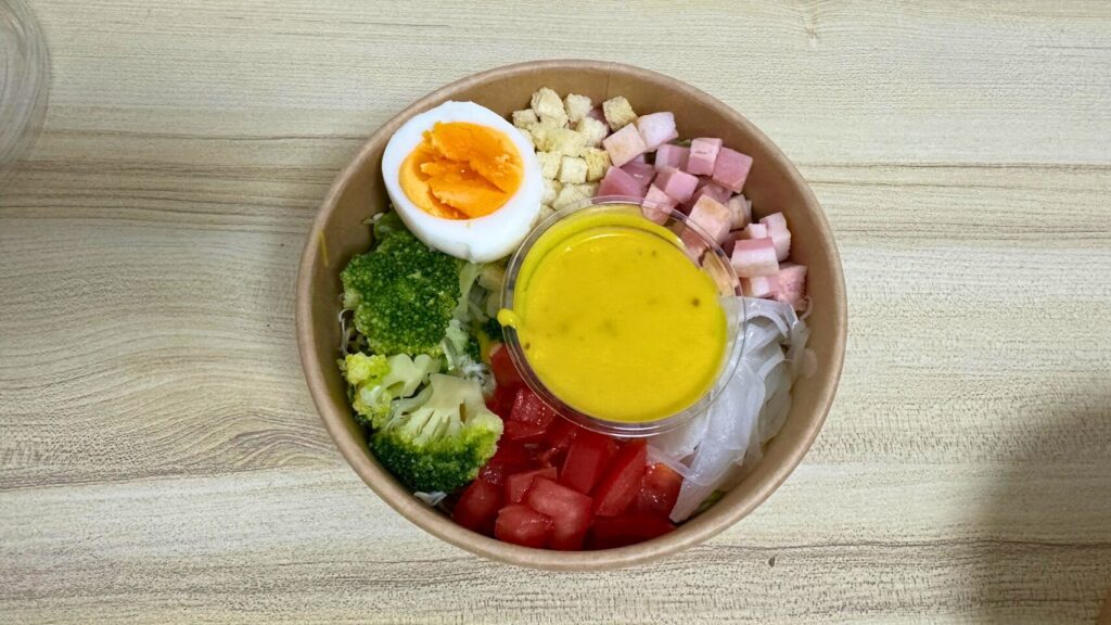 ベーコン、レタス、キャベツ、トマト、ブロッコリー、玉ねぎ、卵、クルトンが入っていて、食感も楽しめる一品です。