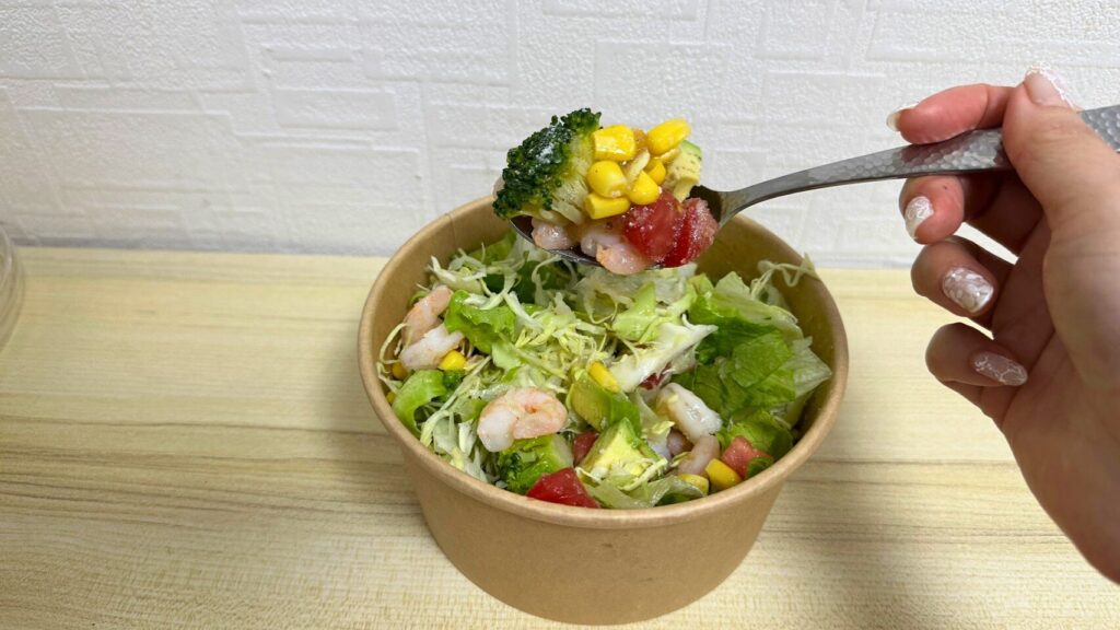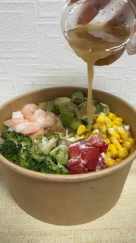 エビ、レタス、キャベツ、アボカド、コーン、トマト、ブロッコリー、パルメザンチーズが入ったサラダです。