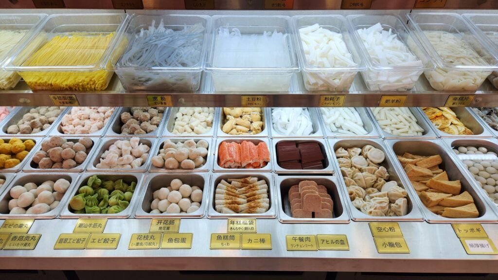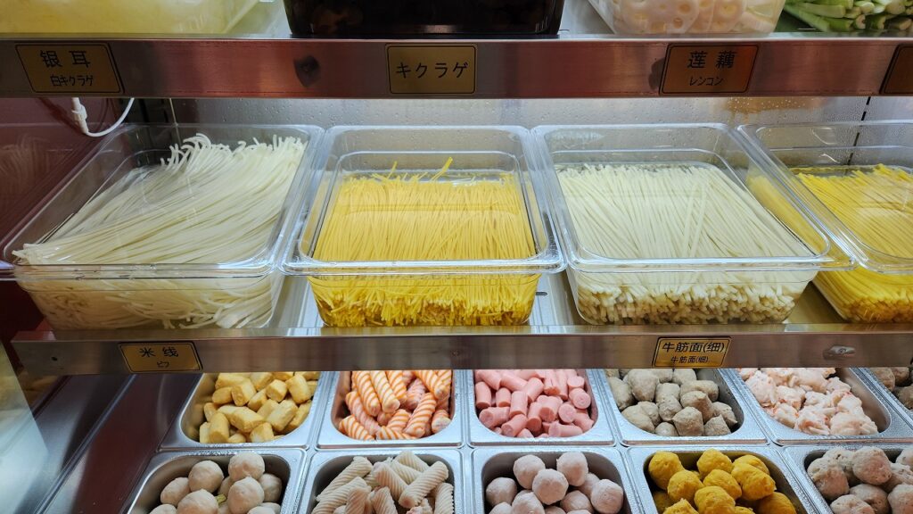 魚介類、お肉、野菜、キノコ、練り物、麺類などなど、非常に多くの種類の具材がある上に、あまり馴染みのないようなものあります。
